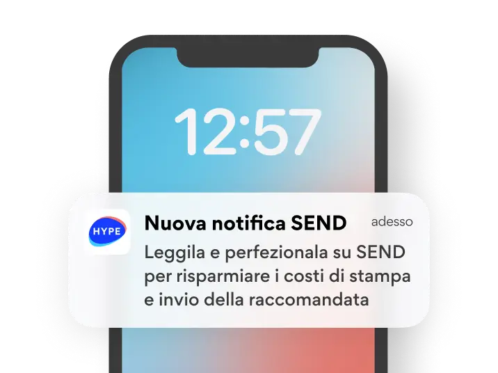 Attivando HYPE come canale di cortesia, quando c'è una comunicazione a valore legale per te su SEND, riceverai un messaggio da HYPE, tramite Push Notification. E, per offrirti un'esperienza ancora più completa, avrai una sezione dedicata nel Centro notifiche dove visualizzare tutti i messaggi di cortesia che ricevi da HYPE.